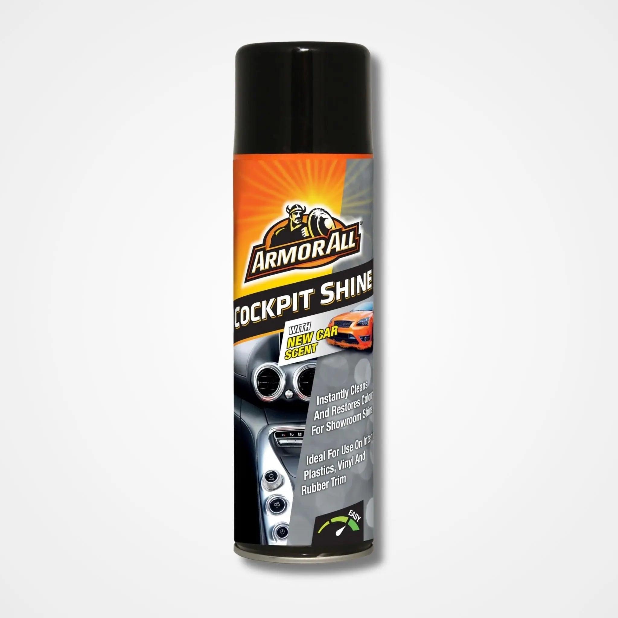 Armor All Cockpit Shine instantly cleans, shines and restores colour to interior plastics, vinyl and rubber trim. The anti-static formulation prevents dust and grime build up. Safe for all colour plastics, vinyl and rubber. Available in multiple fragrances including New Car, Lemon Fresh & Vanilla.